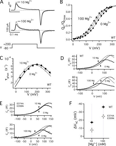 Figure 3. Effects of Mg2+ on gating current were measured in the absence of permeant ions and presence of extracellular tetraethyl ammonium (TEA) to block the pore. (A) Ig evoked by 0.5-ms pulses to +200 mV in the presence (dotted traces) or absence (solid traces) of Mg2+, from two different patches testing the effects 10 or 100 mM Mg2+. (B) Mean QC-V relations in 0 (•), 10 (▵), and 100 (♦) mM Mg2+ are fit by Boltzmann functions with identical equivalent charge (zJ = 0.58e) (Horrigan and Aldrich, 2002) and were normalized by the fit amplitude (QcMax). QC represents the charge distribution for closed channels, determined by fitting the initial 50–100-μs decay of IgON with an exponential function with time constant τgFast and integrating the area under the rising phase and fit (Horrigan and Aldrich, 1999). (C) τgFast-V relations for the patch in A are shifted by −21 mV in 10 mM Mg2+. Relations are fit by functions of the form τgFast = [α(V) + β(V)]−1 where α and β are forward and backward rate constants for voltage sensor activation (0 Mg: α(0) = 58600 s−1, β(0) = 1930 s−1; 10 Mg: α(0) = 45400 s−1, β(0) = 2350 s−1) (zα = 0.3 e, zβ = −0.2e). Representative Cg-V relations obtained with admittance analysis for (D) WT or (E) E374A/E399N channels in the presence (black curves) and absence (gray curves) of 10 or 100 mM Mg2+ are fit by the derivative of a Boltzmann function with respect to voltage (dotted curves) with identical amplitude and charge (zJ = 0.58e). Shifts along the voltage axis indicate the change in VhC (ΔVhC). Arrows indicate the upper voltage limit of the fit that was determined over a range where most channels are closed (Po < 0.1). (F) ΔVhC = [VhC(Mg2+) − VhC(0 Mg2+)] for WT (♦, n = 6) and E374A/E399N (⋄, n = 4) determined from Cg-V relations. |