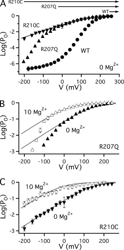 Figure 4. Mg2+ facilitates opening in a voltage-independent manner when voltage sensors are constitutively activated. (A) Mean log(PO)-V relations for WT (•), R207Q (▴), and R210C (▾) in 0 Mg2+. Arrows indicate the voltage range where voltage sensors of WT, R207Q, and R210C are fully activated (see text). Dotted curve represents a Boltzmann fit to R210C with partial charge z = 0.46e that describes the weak voltage dependence of channel opening in both mutants when voltage sensors are fully activated (Ma et al., 2006). (B) Mean log(PO)-V relations for R207Q show that 10 mM Mg2+ (▵) increases PO even when voltage sensors are fully activated. Dotted Boltzmann fits from −20 to +240 mV have identical charge (0.46e) but V0.5 is shifted by −91.6 mV in Mg2+, consistent with a 8.2-fold increase in the C-O equilibrium constant. (C) Mean log(PO)-V relations for R210C show that 10 mM Mg2+(▿) increases the C-O equilibrium constant in a voltage-independent manner when voltage sensors are constitutively activated. Boltzmann fits have identical charge (0.46e) but V0.5 is shifted by −122 mV in Mg2+, consistent with a 16.6-fold increase in the C-O equilibrium constant and a twofold increase in the allosteric coupling factor D. |