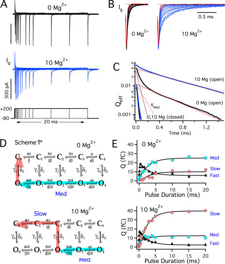 Figure 6. Mg2+ affects voltage sensor deactivation when channels are open. (A) Ig evoked by pulses to +200 mV of different duration (0.05–20 ms) in 0 and 10 mM Mg2+. (B) Normalized OFF currents from A decay more slowly as pulse duration increases, especially in the presence of Mg2+. Red traces represent 0.05 and 0.1-ms pulses. (C) OFF kinetics at −80 mV following brief (closed) or prolonged (open) pulses are compared by plotting the quantity Q = QOFF(t) − QOFFSS on a log scale vs. time where QOFF is the integral of IgOFF and QOFFSS is the steady-state value of QOFF(t). The “closed” traces, representing the average of 0.05 and 0.1-ms records, have an exponential time course with almost identical kinetics (τFast) in 0 Mg2+ (15.5 μs) or 10 mM Mg2+ (16.3 μs). The “open” traces, representing the average of 10, 15, and 20-ms records, were fit by triple exponential functions (0 Mg2+: qFast = 6.2 fC, τFast = 15.5 μs, qMED = 24.9 fC, τMED= 54.1 μs, qSLOW = 11.2 fC, τSLOW = 500 μs; 10 Mg2+: qFast = 2.6 fC, τFast = 16.3 μs, qMED = 10.6 fC, τMED = 127 μs, qSLOW = 39.1 fC, τSLOW = 756 μs). The Med and Slow components of the fits are shown as dotted and solid lines respectively. (D) Scheme 1* depicts the five closed (Ci) and open (Oi) states defined by Scheme 1, where i represents the number of activated voltage sensors (i = 0–4). δi and γi are forward and reverse rate constants for channel opening while α and β are rates for voltage sensor activation when channels are closed, and f = . Colored arrows represent different pathways of deactivation and QOFF components for open channels in 0 Mg2+ (top) or 10 mM Mg2+ (bottom) at −80 mV. In 10 mM Mg2+, channels can close from open states other than O0 because Mg2+ allows voltage sensors in open channels to remain activated at −80 mV (QO, Fig. 5 E). The figure illustrates one possible pathway, through the O2 state. After channels close, voltage sensors can completely deactivate in 10 mM Mg2+ (QC, Fig. 3 B). This charge movement is limited by the closing rate and therefore contributes to the Slow component of QOFF. (E) The amplitude of the three OFF components (Fast, ▴; Med, light blue square; Slow, pink circle) for the experiment in A are plotted vs. pulse duration and fit by exponential functions (0 Mg2+, τ = 2.8 ms; 10 Mg2+, τ = 2.6 ms). |