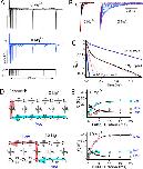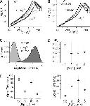 Figure 5. Effects of Mg2+ on different binding sites were determined by measuring PO for WT and mutant channels in 0–100 mM Mg2+ (0, blue circle; 2, □; 5, ▿; 10, blue triangle; 21, ; 100, blue diamond, mM Mg2+). (A) Normalized mean GK-V relations for the WT in 0–100 mM Mg2+. (B) Mean log(PO)-V relations for WT in 0, 10, and 100 mM Mg2+ reveal that 100 Mg2+ increases PO at extreme negative voltages. These plots represent the same data as in A but were averaged in 20 mV rather than 10-mV bins to match the voltage interval for low PO measurements. Dotted lines are exponential fits to PO at extreme negative voltages in 0 and 100 Mg2+ with partial charge zL = 0.3e. (C) Mean log(PO)-V relations in 0, 10, and 100 mM Mg2+ for E374A/E399N show that mutation of the putative Mg2+ site in RCK1 almost abolishes effects of 10 mM Mg2+ but leaves the PO increase by 100 Mg2+ (dotted lines) intact. (D) Mean log(PO)-V relations in 0, 10, and 100 mM Mg2+ for R167E achieve a limiting slope at more positive voltages than the WT, confirming that PO is increased by 100 Mg2+ when voltage sensors are in the resting state (dotted lines). Inset graph plots the ratio of NPO in the presence and absence of Mg2+ at −80 mV from a larger set of experiments. (E) Mean qa-V relations for the WT in 0, 10, and 100 mM Mg2+ were derived from the slope of log(PO)-V in B (see text). Solid curves are estimates of the QO-V relation determined by fitting the foot of the qa-V relation (to ∼80% of peak qa) with a function qa = zL + 4zJ [1 + exp([VhO − V]zJ/kT)]−1 where zL = 0.3e, zJ = 0.58e, and VhO = 26.5 ± 2.1, −33.6 ± 2.4, −65.6 ± 3.7 mV in 0, 10, and 100 mM Mg2+, respectively. (F) Plot of ΔΔVCO = ΔVhC − ΔVhO for 10 and 100 mM Mg2+ in WT (blue circle) and E374A/E399N (red square) channels where ΔVhO = [VhO(Mg2+) − VhO(0 Mg2+)] was estimated from the qa-V relation as in E and ΔVhC was determined from gating current (Fig. 3 F). Nonzero values of ΔΔVCO indicate that Mg2+ alters voltage sensor/gate coupling in the WT. However, effects on coupling are abolished by the E374A/E399N mutation. (G) Alternative representation of Scheme 2 (Fig. 2 F) shows the four states defined by the voltage sensor and gate conformation in each subunit and the equilibrium constants defined by Scheme 1 (Fig. 2 E). Boxes denote the states stabilized by ligand binding, as defined by allosteric factors C and E. (H) In Scheme 3, the allosteric factor F defines a stabilization of the OA state that alters voltage sensor/gate coupling (allosteric factor D). Dotted curves in A–E represent simultaneous fits to the Po-V, log(PO)-V, and qa-V relations in 0, 10, and 100 mM Mg2+ using Scheme 1 (Fig. 2 E) (Table I parameters WTA, E374A/E399N). Solid black curves in A and B represent an alternative fit to the WT data (WTB parameters). Red curves in A represent fits to a two-site model (Eq. 2) that assumes each subunit in the WT contains a very low affinity and an RCK1 binding site described by Schemes 2 and 3, respectively (Table II parameters). |