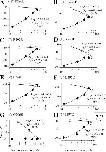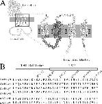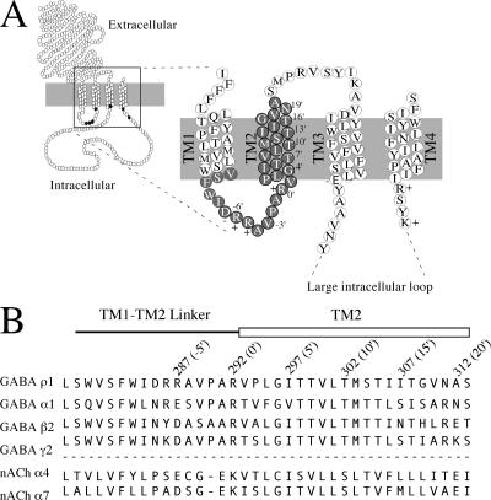 Figure 1. Diagram of proposed ρ1 GABA receptor subunit topology and transmembrane domain sequences. (A) Endogenously charged residues are indicated by the appropriate charge sign and these residues were neutralized in this study to examine the role of endogenous charges on ionic selectivity. The TM2 numbering system used in the manuscript begins with the 0′ TM2 arginine with increasing numbers proceeding toward the C terminus. Charge-scanning mutants covered the region from −12′ (intracellular valine, V) to 20′ (extracellular alanine, A) and are indicated with gray-filled circles. This figure is to merely show the extent of the residues examined in this study and the secondary structure or positions of these residues with respect to the membrane should not be taken literally. (B) Aligned TM1–TM2 linker and TM2 sequences from several representative members of the receptor family. Anionic members are above the dashed line, cationic members are below. The GABA ρ1 receptor sequence is human, all others are rat. |