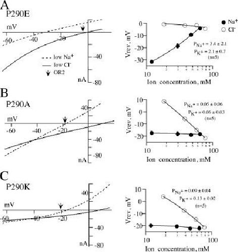 Figure 3. A negatively charged substitution at P290 (−2′) results in cation-preferring receptors. (A) Amplitudes of GABA-induced currents from P290E were measured at a continuously varying membrane potential using the ramp protocol described in the Materials and methods. Ramps obtained in low sodium OR2 are the dashed lines and those in low-chloride OR2 are the solid lines. The normal OR2 ramp is omitted for clarity, but the reversal potential is indicated with an arrow. For the graph on the right, reversal potentials were measured at different concentrations of sodium (solid) or chloride (open) and fit with the GHK equation (Eq. 2) to determine the relative permeability coefficients. Substitution of negatively charged glutamate for the native proline at position 290 (−2′) resulted in cation-preferring receptors, but receptors were chloride selective when this site was mutated to neutral alanine (B) or positively charged lysine (C). |