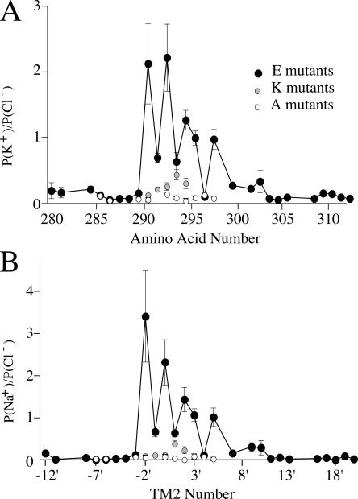 Figure 5. Alternate glutamate mutants at the intracellular end of TM2 are cation preferring. (A) Relative potassium permeability plotted against amino acid number shows the alternating pattern of cationic glutamate mutants (solid circles). Substitutions by positive lysine residues (gray circles) resulted in only small increases in potassium permeability. Substitution by neutral alanines (open circles) had no significant effect on ionic permeabilities. (B) Same as A, showing relative sodium permeability of mutant receptors. |