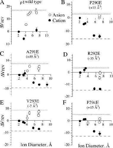 Figure 7. Glutamate substitutions do not alter the apparent pore size. (A–F) Reversal potentials were measured after substitution with anions (open symbols) and cations (closed symbols) of different diameters. The dashed and dotted lines indicate the calculated reversal potential shift for an impermeant anion or cation, respectively, and were based on the determined relative permeabilities for that particular mutant. For the wild-type receptor, the reversal potential shift approaches its maximum value for anions between 4 and 6 Å. Using this approximation, the data indicate that for all cases, the pore size was between 4 and 6 Å. The cations and their diameters (in Å) were as follows: cations, sodium, 1.9; rubidium, 3.0; cesium, 3.4; imadazole, 4.8; choline, 5.6; triethanolamine, 7.0; N-methyl-d-glucamine, 9.0; anions, bicarbonate, 4.1; acetate, 4.5; propionate, 5.1; gluconate, 6.9; isethionate, 7.0. Under the particular mutation, we provide the difference in side chain volume imparted by the substitution. |