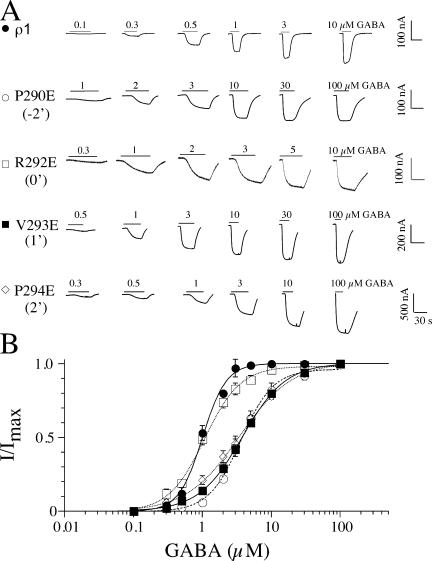 Figure 2. Dose–response relationships for selected glutamate scan mutants. (A) GABA-gated currents at a range of agonist concentrations in oocytes expressing the indicated mutants are shown. (B) Maximum current amplitudes were plotted as a function of GABA concentration and fitted with the Hill equation (Eq. 1 in Materials and methods). Parameters from these fits are provided in Table I. In general, the mutations had a modest effect on agonist sensitivity. |