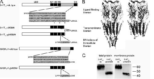 Figure 1. Constructs used in this study. (A) Schematic depiction of constructs. The N-terminal ligand binding domain is followed by transmembrane segments (black boxes). M1, M2, and M3 are connected by short loops. The cytoplasmic domain is mainly formed by a large loop (gray box) between M3 and M4. The amino acid sequence of the α-helical end of M3, the M3M4 loop (shaded gray) and the α-helical beginning of M4(Unwin, 2005), is shown. Amino acids that were removed/introduced are shaded gray. Arginines mutated in the 5-HT3A-QDA mutant are indicated by asterisks. (B) Homology models of the 5-HT3A wild type (left) and 5-HT3A-glvM3M4 (right) based on nAChR model (Unwin, 2005). Arginines in the 5-HT3A MA helices and in the truncated M3M4 loop of 5-HT3A-glvM3M4 are shown in spacefilling representation. The only part of the intracellular domain that is shown (left) are the MA helices because the rest of this domain is disordered in the nAChR structure. (C) SDS-PAGE/Western blot analysis of total and plasma membrane protein fractions from oocytes. 5-HT3A-V5-wt protein (53 kD) and 5-HT3A-V5-glvM3M4 protein (41 kD) bands are observed.