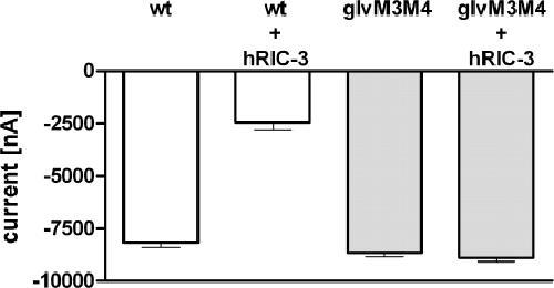 Figure 4. Coexpression of hRIC-3 inhibits 5-HT3A but not 5-HT3A-glvM3M4 expression. Average peak currents elicited by a saturating 5-HT concentration recorded in oocytes injected with 10 ng mRNA for 5-HT3A or 5-HT3A-glvM3M4 either alone or together with 5 ng mRNA for hRIC-3.