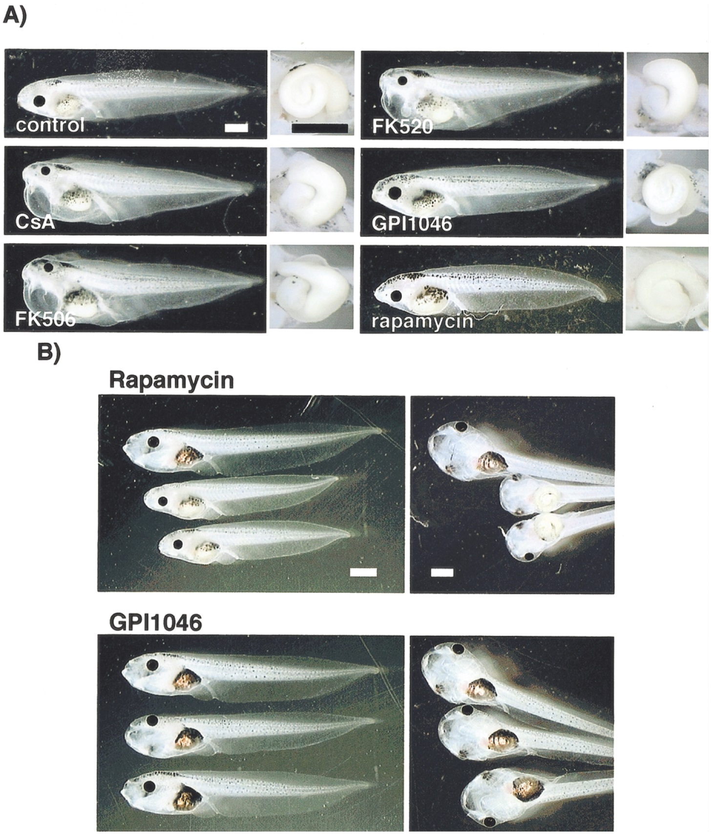 the respective non-calcineurin inhibitor (lower two embryos). Left, lateral view; right, ventral view. Bars, 1 mm.