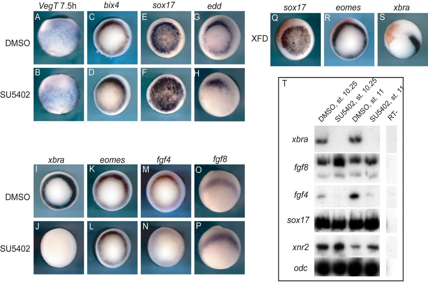 Figure 2. FGF signaling effects on endoderm and mesoderm. These embryos have been processed by in situ hybridization for expression of the indicated transcript above each column. Embryos were treated with DMSO or SU5402 from the 8- to 16-cell stage as indicated on the side. A,B: Lateral views; embryos were collected at the blastula stage, 7.5 hr post-fertilization. C-S: Gastrula stage. C-N: Blastoporal views. O,P: Lateral views with vegetal to the bottom. Q-S: Embryos were injected into one cell at the two-cell stage with the dominant-negative FGFR1 construct XFD (500 pg); the red staining is the lineage tracer n beta gal. T: Whole embryos were treated with either DMSO or SU5402, collected at the time indicated above the lanes, and analyzed by RT-PCR for expression of the indicated markers along the side. ODC was used as a loading control. |