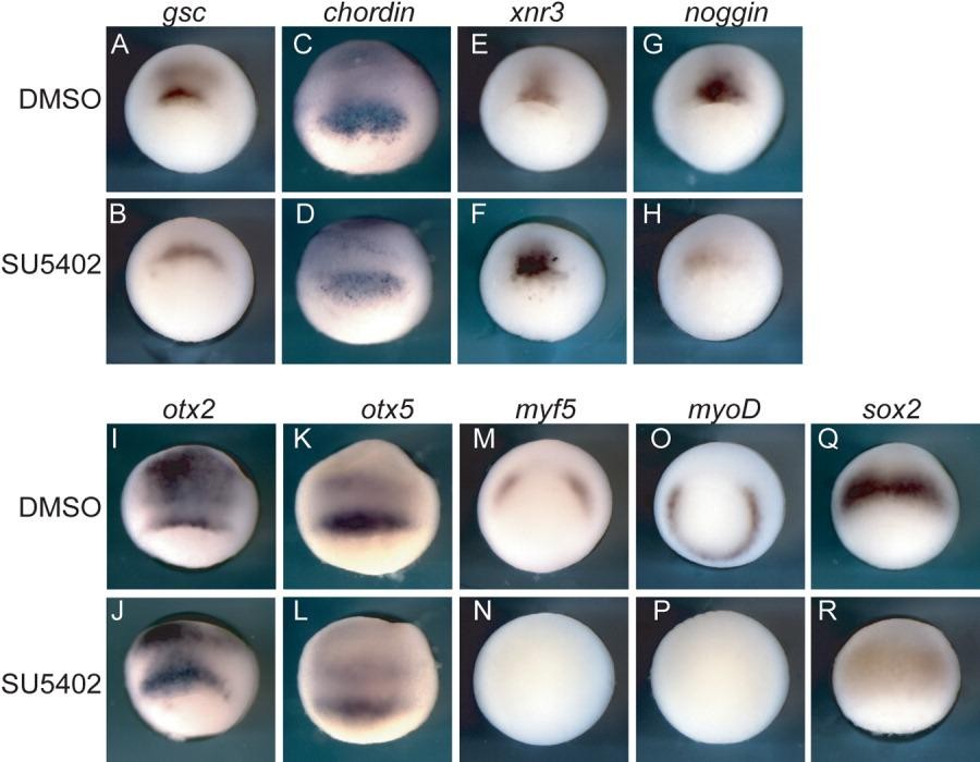 Figure 3. The involvement of FGF signaling in organizer and paraxial mesoderm development. Embryos were treated with either DMSO or SU5402 from the 8- to 16-cell stage and analyzed at the gastrula stage for expression of the indicated transcripts. A,B,E-H,M-P: Embryos are displayed in a lateral blastoporal view. C,D,I-L,Q,R: Embryos are displayed from a lateral view with blastopore toward the bottom. Axial/organizer genes are present, but expression of paraxial mesodermal transcripts is absent in inhibitor-treated embryos. |