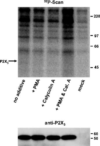 Fig. 7. PMA and calyculin A do not induce phosphorylation of P2X3 receptors in intact HEK cells. Mock- and P2X3 receptor-transfected HEK293 cells were incubated with [32P]orthophosphate (500 μCi/ml) for 3 h in phosphate-free DMEM, followed by a 10-min incubation with 100 nM of each, the PKC activator PMA and/or the phosphatase inhibitor calyculin A. Triton X-100 extracts were then prepared from the cells and subjected to immunoprecipitation using the peptide-specific P2X3 subunit polyclonal antibody, followed by reducing SDS-PAGE and phosphorimaging. The migration position of the P2X3 subunit is marked by an arrow, indicating the absence of 32P incorporation into the P2X3 subunit. P2X3 receptor expression was verified by immunoblotting with the P2X3 subunit polyclonal antibody (bottom panel)