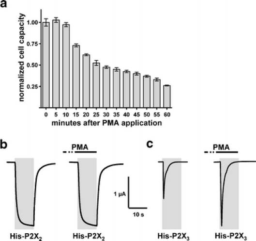 Fig. 2. Effect of PMA on ATP-induced currents mediated by expressed P2X2 and P2X3 receptors in X. laevis oocytes. a The electrical membrane capacitance was monitored as a measure of the oocyte surface area during sustained stimulation with PMA. Each bar represents the mean Cm±SEM calculated from the areas under the current transients elicited in 10-s intervals by five consecutive 10-mV depolarizing steps. b, c Representative current traces elicited by 10-s lasting pulses of 100 μM ATP applied in 10-min intervals to oocytes expressing the indicated P2X receptors or P2X receptor mutants. Where denoted by a black bar, oocytes were pre-incubated with 100 nM PMA before ATP was co-applied. PMA was without effect on the P2X2 receptor-mediated current (b), but induced a marked increase of the current amplitude mediated by P2X3 receptors (c). Gray areas indicate the duration of ATP application