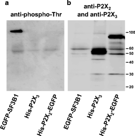 Fig. 4. Immunoblotting reveals no constitutive phosphorylation of HEK293 cell-expressed P2X2 and P2X3 receptors. The indicated proteins were isolated by immunoprecipitation using the peptide-specific P2X3 subunit polyclonal antibody or an EGFP-specific polyclonal antibody as appropriate and resolved by reducing SDS-PAGE. a Shown is an immunoblot probed by phosphothreonine-specific monoclonal antibody and a peroxidase-conjugated secondary antibody. Note that phosphorylation of the P2X3 receptor or the EGFP-tagged P2X2 receptor is not detectable, whereas a positive control—the EGFP-tagged splicing factor SF3B1 (migration mass 97 kDa [23])—was detected by the antibody. b The same samples as in panel a were immunoblotted using peptide-specific P2X2 and P2X3 subunit polyclonal antibodies to verify the expression of the transfected genes
