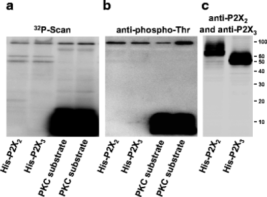 Fig. 6. PKC phosphorylates a specific PKC substrate in vitro, but does not phosphorylate P2X2 or P2X3 receptors. The immunoprecipitated recombinant P2X2 or P2X3 receptor from X. laevis oocytes or a synthetic peptide (1 or 10 μg) derived from the non-structural protein 3 of hepatitis C virus, which serves as a specific substrate for PKC, were incubated for 30 min with purified rat brain PKC catalytic subunit (0.02 μg corresponding to 0.02 U/μl) in the presence of 50 μM [γ-32P]ATP (10 mCi/ml), and then subjected to SDS-PAGE and phosphorimaging. The rat brain PKC catalytic subunit does not require Ca2+ and phosphatidylserine for activity [42]. 32P was incorporated into the PKC substrate (left panel) and was also detected by immunoblotting with an anti-phosphothreonine antibody (middle panel). However, there was no detectable 32P incorporation at a migration position of ∼66 kDa or ∼54 kDa of the P2X2 or P2X3 subunit, respectively, the presence of which could be verified by immunoblotting (right panel)