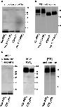 Fig. 5. Lysates of X. laevis oocytes or HEK293 cells contain endogenous PKC, but do not support PMA-driven phosphorylation of P2X2 or P2X3 receptors. The indicated wild-type and mutant P2X receptors were purified by non-denaturing Ni2+ chelate chromatography from X. laevis oocytes, supplemented with [γ-32P]ATP, 100 nM PMA and oocyte lysate (a) or HEK293 cell lysate (b), and incubated for 30 min at ambient temperature. In parallel, a peptide PKC substrate (final concentration 0.5 μg/μl) was incubated with [γ-32P]ATP, PMA and either of the two cell lysates or the purified rat brain PKC catalytic subunit as indicated. The proteins were resolved by reducing SDS-PAGE and visualized by phosphorimaging. Note that the band pattern was similar irrespective of whether protein of mock-injected oocytes or P2X receptor-expressing oocytes was used as a substrate, arguing against specific labelling of either P2X receptor. Arrows indicate migration positions of P2X1, P2X2 and P2X3 subunits. Arrowhead in a, dominant background band that is present in all oocyte samples. The peptide PKC substrate was similarly labelled by lysates or purified rat brain PKC, confirming the presence of endogenous PKC in X. laevis oocytes and HEK293 cells. c The same samples as in panels a and b were resolved on a separate SDS-PAGE gel. The indicated P2X subunits were detected by immunoblotting using the appropriate P2X subunit-specific polyclonal antibodies. A sample of mock-transfected cells was simultaneously probed with the P2X2 and P2X3 subunit-specific polyclonal antibodies