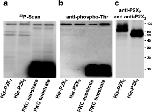 Fig. 3. Immunoblots show no constitutive phosphorylation of oocyte-expressed P2X2 or P2X3 receptors. The indicated wild-type or mutant P2X subunits were purified by Ni2+ chelate chromatography from [35S]methionine-labelled X. laevis oocytes and resolved by denaturing SDS-PAGE. a Shown is a representative immunoblot probed with a phosphothreonine-specific monoclonal antibody and a peroxidase-conjugated secondary antibody. No phosphorylation signal could be detected at the SDS-PAGE migration position of P2X2 and P2X3 subunits, which are indicated by the adjacent PhosphorImager scan in panel b. b Direct PhosphorImager visualization of metabolically [35S]methionine-labelled parent and mutant P2X subunits resolved by SDS-PAGE of the same samples as in panel a. cLeft panel: representative immunoblot of P2X2 subunits tagged with either an N-terminal or C-terminal hexahistidine sequence (designated His-P2X2 or P2X2-His, respectively) and probed with a phosphothreonine-specific monoclonal antibody and a peroxidase-conjugated secondary antibody. No phosphorylation signal could be detected at the SDS-PAGE migration position of P2X2 subunits, which were visualized by immunoblotting with the P2X2 subunit polyclonal antibody (middle panel) or PhosphorImager scanning of incorporated [35S]methionine (right panel)