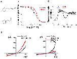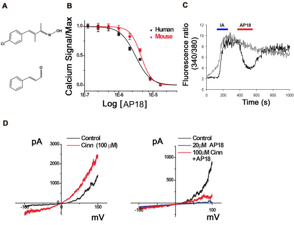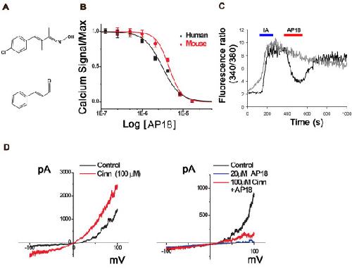 Figure 1. AP18 blocks TRPA1 activation. (A) Chemical structures of the AP18 (upper) and cinnamaldehyde (lower). (B) Dose-response relationships for block of the calcium influx by AP18 into CHO cells expressing mouse and human TRPA1 elicited by 50 μM cinnamaldehyde (left panel). Calcium influx was measured using a standard FLIPR assay, data points are the average of four wells (~8,000 cells/well) and error bars show standard error. Values are normalized to the maximal response (observed in the absence of AP18). (C) Ratiometric Ca2+ imaging of average of ~50 mTRPA1-expressing CHO cells in response to 1 mM Iodoacetamide (IA) and 100 μM of AP18 (black trace). Grey trace represents cells that were treated with IA alone. (D) Current-voltage relationship of TRPA1. Outward rectifying currents elicited by cinnamaldehyde (left panel) in inside-out macropatches derived from TRPA1-expressing Xenopus oocytes were suppressed by AP18 coapplications (right panel).