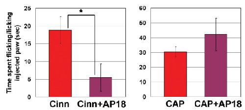 Figure 3. AP18 suppresses acute nociceptive behaviours caused by cinnamaldehyde but not capsaicin. Time spent licking and flicking hindpaws injected with cinnamaldehyde (16.4 mM) or capsaicin (0.328 mM) was measured for five minutes and compared with animals co-injected with AP18 (1 mM). Numbers of cases for each experiment from the left is 8, 8, 6 and 6, respectively (*p < 0.05, two-tailed Student's t-test).
