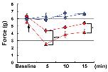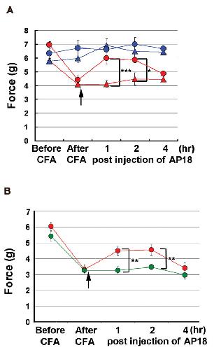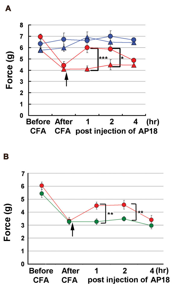 Figure 7. Bradykinin (BK)-induced mechanical hyperalgesia is partially blocked by AP18. Same designation of symbols as in Figure 4A is used; however, BK (instead of CFA) is co-injected with AP18 in wildtype mice, and mechanical sensitivity is measured within 15 minutes (n = 12). Arrow indicates time of AP18 (or vehicle) injections. ***p < 0.001, *p < 0.05, two-tailed Student's t-test.