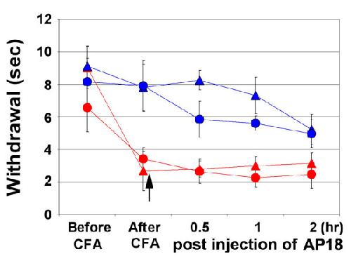 Figure 5. AP18 does not reverse CFA-induced heat hyperalgesia. Same designation of symbols as in Figure 4A is used. Arrow indicates time of AP18 (or vehicle) injections. Paw-withdrawal latencies to infrared 20 setting are measured and averaged (n = 8).