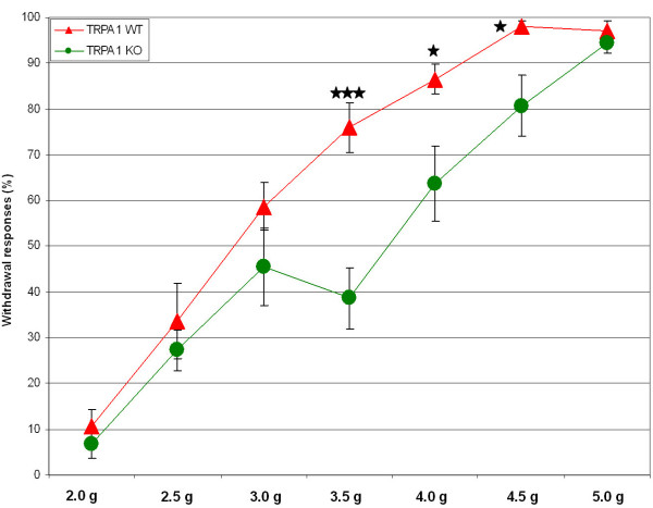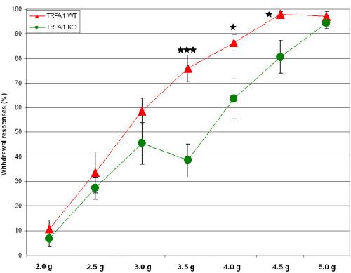 Figure 6. Acute mechanosensory phenotype in TRPA1-deficient mice. Frequency of paw withdrawal to fixed forces applied to the hindpaw is measured. 13 WT and 11 TRPA1-deficient male mice were tested. Briefly, hindpaws were exposed to the force actuator starting with the greatest force. Each force was applied eight times at ~1/s. The actual g-force values used differ between this study and Kwan et al. (2006) probably due to the use of different instrumentation [16].