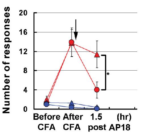 Figure 8. AP18 partially reverses cold hyperalgesia in rats treated with CFA. Same designation of symbols as Figure 4A is used. Number of flicks, licks, paw raises are counted for 10 minutes and averaged on a 5°C cold plate (n = 8). Arrow indicates time of AP18 (or vehicle) injections. *p < 0.05, two-tailed Student's t-test.