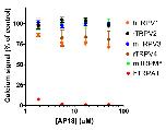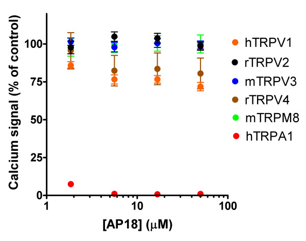 Figure 2. AP18 specifically blocks TRPA1. Calcium influx (FLIPR) in HEK cells transiently transfected with the indicated cDNAs in response to 200 nM capsaicin (TRPV1), 150 μM 2-APB (TRPV2), 30 μM 2-APB (TRPV3), 20 μM 4alpha-PDD (TRPV4), 20 μM menthol (TRPM8), and 80 μM cinnamaldehyde (TRPA1). Values are given as a percentage of agonist response in the absence of AP18.