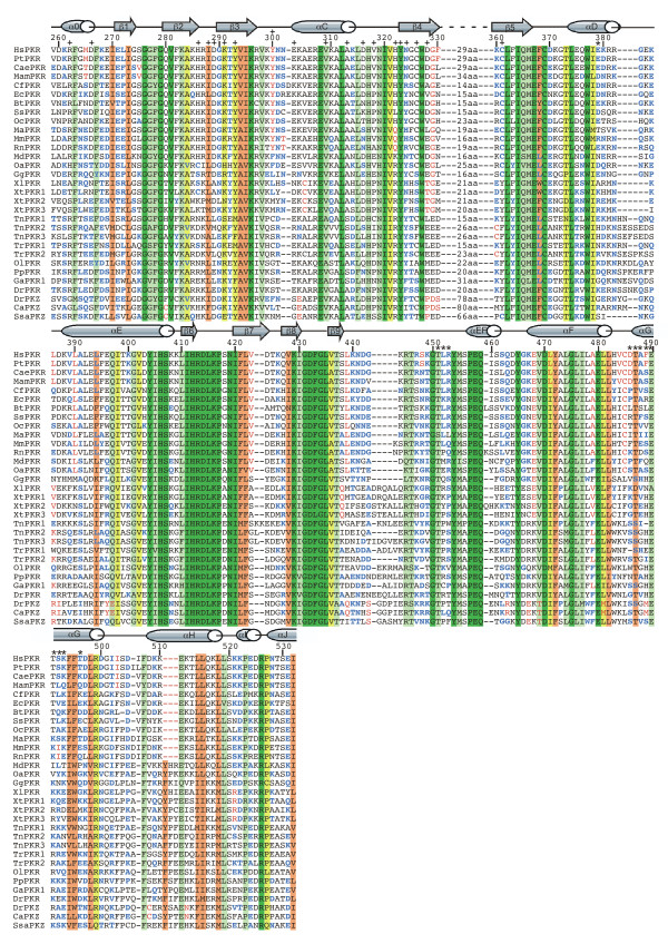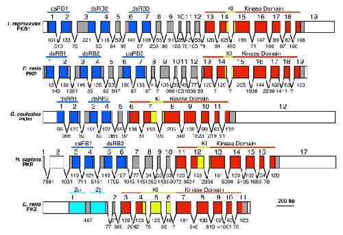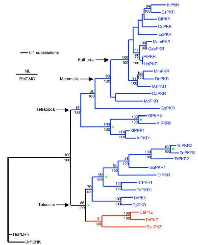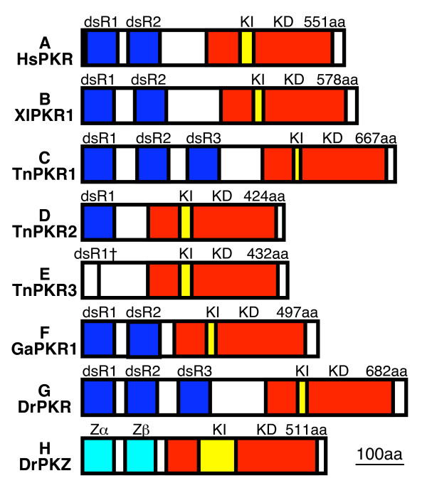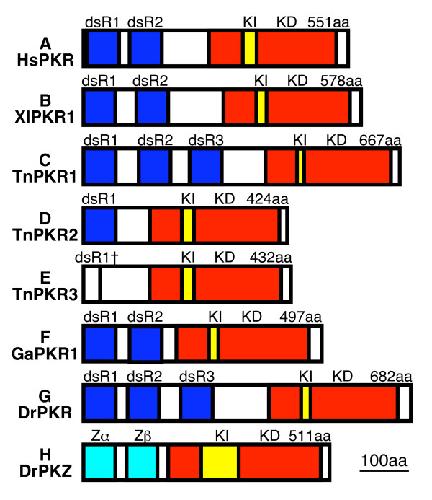Double-stranded RNA-activated protein kinase PKR of fishes and amphibians: varying the number of double-stranded RNA binding domains and lineage-specific duplications.