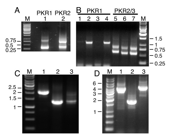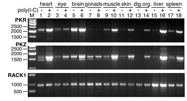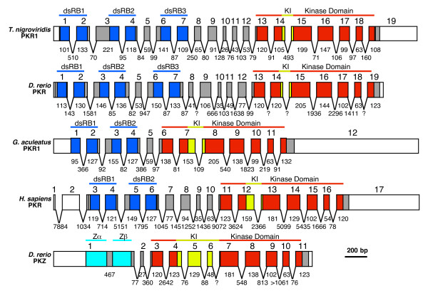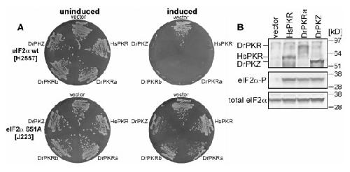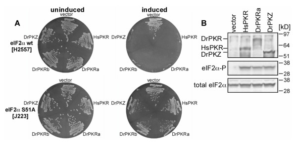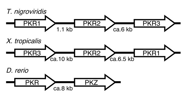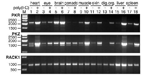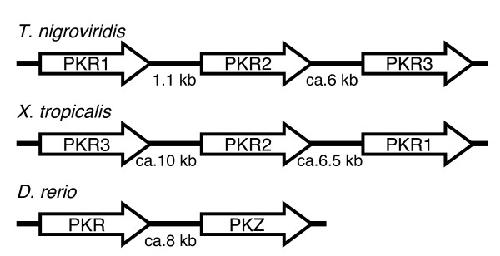 BACKGROUND: Double-stranded (ds) RNA, generated during viral infection, binds and activates the mammalian anti-viral protein kinase PKR, which phosphorylates the translation initiation factor eIF2alpha leading to the general inhibition of protein synthesis. Although PKR-like activity has been described in fish cells, the responsible enzymes eluded molecular characterization until the recent discovery of goldfish and zebrafish PKZ, which contain Z-DNA-binding domains instead of dsRNA-binding domains (dsRBDs). Fish and amphibian PKR genes have not been described so far. RESULTS: Here we report the cloning and identification of 13 PKR genes from 8 teleost fish and amphibian species, including zebrafish, demonstrating the coexistence of PKR and PKZ in this latter species. Analyses of their genomic organization revealed up to three tandemly arrayed PKR genes, which are arranged in head-to-tail orientation. At least five duplications occurred independently in fish and amphibian lineages. Phylogenetic analyses reveal that the kinase domains of fish PKR genes are more closely related to those of fish PKZ than to the PKR kinase domains of other vertebrate species. The duplication leading to fish PKR and PKZ genes occurred early during teleost fish evolution after the divergence of the tetrapod lineage. While two dsRBDs are found in mammalian and amphibian PKR, one, two or three dsRBDs are present in fish PKR. In zebrafish, both PKR and PKZ were strongly upregulated after immunostimulation with some tissue-specific expression differences. Using genetic and biochemical assays we demonstrate that both zebrafish PKR and PKZ can phosphorylate eIF2alpha in yeast. CONCLUSION: Considering the important role for PKR in host defense against viruses, the independent duplication and fixation of PKR genes in different lineages probably provided selective advantages by leading to the recognition of an extended spectrum of viral nucleic acid structures, including both dsRNA and Z-DNA/RNA, and perhaps by altering sensitivity to viral PKR inhibitors. Further implications of our findings for the evolution of the PKR family and for studying PKR/PKZ interactions with viral gene products and their roles in viral infections are discussed.