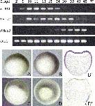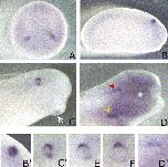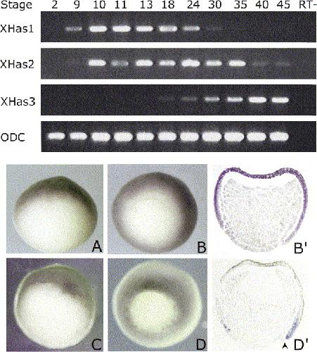 Fig. 1. Upper panel: temporal expression of XHas1, XHas2 and XHas3 by RT-PCR from total RNA at different stages of Xenopus development. RT-PCR with ODC primers was used as a loading control. RTâ: RNA sample without reverse transcriptase was used as a negative control for PCR. Lower panel: whole-mount in situ hybridization analysis of XHas1 (A,B,Bâ²) and XHas2 (C,D,Dâ²) at blastula and gastrula stages. (A) XHas1 is distributed in the animal pole of the embryo at stage 9. (B) XHas1 expression covers the entire ectoderm at stage 11, as even shown in the corresponding histological section (Bâ²). (C) XHas2 expression at stage 9 with a faint signal in the animal pole and a higher labelling in the marginal zone. (D) At stage 11, XHas2 is distributed as a ring with a dorso-ventral gradient of expression around the closing blastopore. (Dâ²) A histological section of the embryo shown in D. The arrowhead indicates the dorsal blastopore lip.