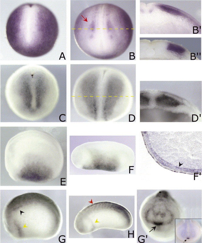 Fig. 2. Whole-mount in situ hybridization analysis of XHas1 (A,B,Bâ²,E,F,Fâ²) and XHas2 (C,D,Dâ²,G,H,Gâ²) at neurula and early tailbud stages. (A) At stage 13, XHas1 is present in non-neural ectoderm. (B) At stage 17, XHas1 appears in the neural crest cells (NCC), red arrow. (Bâ²) A stage 17, dissected embryo shows the XHas1 expression in the cephalic NCC. (Bâ²) XFoxD3 mRNA expression in the cephalic NCC at stage 17. (C) At stage 13, XHas2 is expressed in paraxial mesoderm. (D,Dâ²) At stage 18, XHas2 expression is confined in the pre-somitic mesoderm as shown in whole and dissected embryo. (E) At stage 21, XHas1 is down-regulated in the ectoderm and in the NCC. (F,Fâ²) XHas1 expression in stage 24 whole embryo and in the corresponding histological section. (G,H) XHas2 distribution in stage 21 and stage 24 embryos. Yellow arrowhead: heartprimordium. Black arrowhead: pronephric anlage. Red arrowhead: trunk neural crest cells. (Gâ²) Frontal view of stage 21 embryo showing XHas2 expression in the head region. The arrow indicates the expression in a region containing the pituitary anlage. The pituitary anlage is revealed by the expression of Xlim-3 reported in the inset.