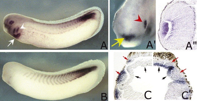 Fig. 3. Whole-mount in situ hybridization analysis of XHas1 and XHas2 at tailbud stages. (A) XHas2 expression at stage 28. White arrow: the heart, white arrowhead: branchial arches. (Aâ²) Frontal view of a stage 28 embryo showing the XHas2 expression in the eye (red arrowhead) and in an anteriorhead region containing the pituitary (yellow arrow). (Aâ²) Histological section of a stage 28 embryo at the eye level showing XHas2 expression in the lens. (B) XMyoD expression in a stage 28 embryo. (C and Câ²) Horizontal sections of stage 27 embryos hybridized with XSox9 and XHas2 probes, respectively. Red arrows: migrated NCCs. Black arrows: endodermal part of the pharyngeal pouch.