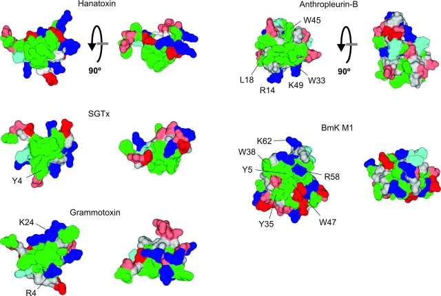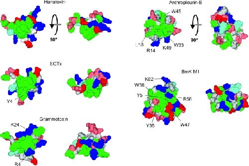 Molecular surface of tarantula toxins interacting with voltage sensors in K(v) channels.