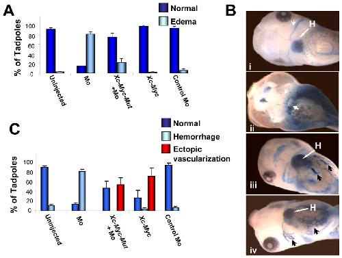 Fig. 5. Edema provoked by Xc-Myc knockdown is intrinsic and specific and Xc-Myc overexpression induces ectopic vascular beds. (A) The percentage of Xc-Myc morpholino-injected embryos that developed edema (light blue bars) or appeared normal (dark blue bars) is shown. Co-injection of Xc-Myc-Mut rescued the edema phenotype. (B) Representative images of stage 45 control (i) or those injected with Xc-Myc morpholino (ii), with both Xc-Myc-Mut mRNA and Xc-Myc morpholino (iii) [note rescue of phenotype and hypervascularization (black arrows)], or with Xc-Myc RNA (iv), showing hypervascularization and ectopic vascular beds (black arrows). (C) The percentage of Xc-Myc morpholino-injected embryos with hemorrhage. Co-injection of Xc-Myc-Mut mRNA rescued the phenotype. Injection of either wild-type Xc-Myc or mutant Xc-Myc-Mut mRNA induced hypervascularization (red bars).