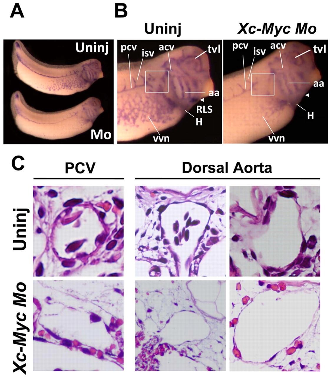 Fig. 3. Xc-Myc knockdown impairs endothelial cell development. (A,B) Whole mount in situ hybridization (stage 37) for endothelial lineage marker X-msr; (B) enlargement of the embryos shown in A. X-msr staining is reduced and diffuse in Xc-Myc knockdown embryos throughout, and the vitelline vein network (vvn), aortic arches (aa), tunica vasculosa lentis (tvl), anterior cardinal vein (acv) and rostral lymph sac (RLS) are reduced or missing. H, heart; pcv, posterior cardinal vein; isv, intersegmental vessels. (C) Histology of posterior cardinal vein (pcv) and dorsal aorta at stage 37. Uninj, uninjected control; Xc-Myc Mo, Xc-Myc morpholino-injected embryos. The vessels found in Xc-Myc morpholino-injected embryos have remarkably thin walls and empty lumens. Analyses based on five or six embryos from two different experiments.