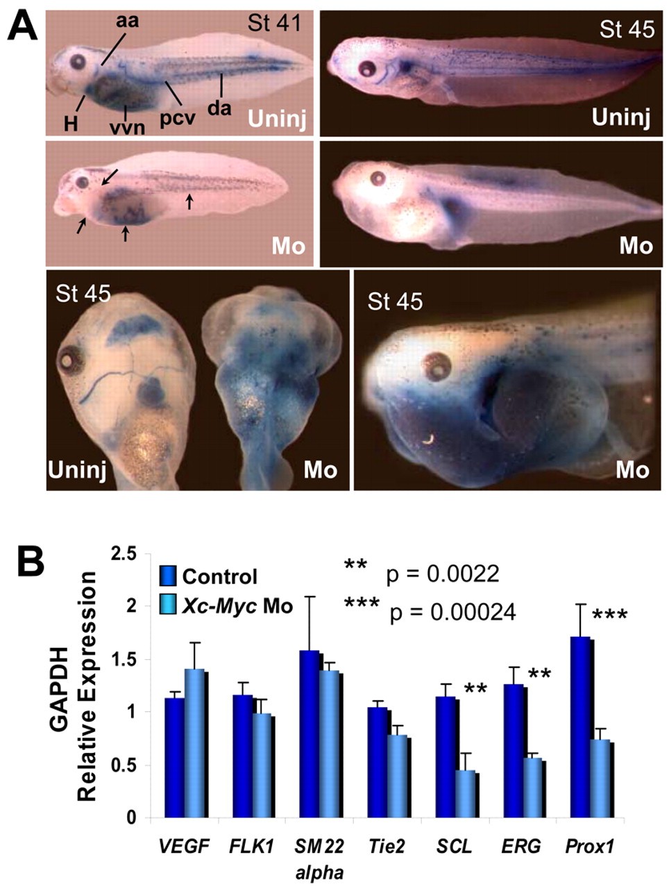 Fig. 4. Edema provoked by Xc-Myc knockdown is associated with massive hemorrhage and impaired expression of X-ERG, Scl and Prox1. (A) The vascular networks of uninjected (Uninj) and Xc-Myc morpholino (Mo)-injected embryos were visualized by staining blood cells with benzidine. Hemorrhagic areas are present throughout body proper of Mo-injected embryos. H, heart; aa, aortic arches; vvn, vitelline vein network; pcv, posterior cardinal vein; da, dorsal aorta. (B) The effects of Xc-Myc knockdown on the expression of genes involved in vascular development was assessed by qRT-PCR in control (dark blue bars) and Xc-Myc morpholino-injected (light blue bars) embryos at stage 28. Expression was normalized to Gapdh.