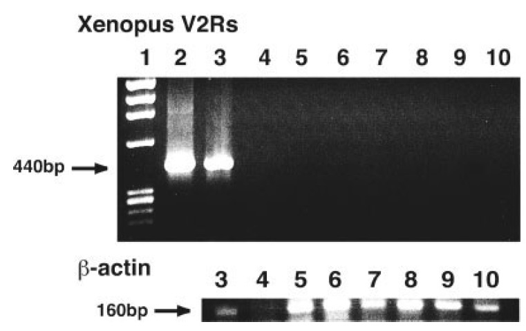 V2Rs and -actin cDNA, respectively. The marker used was the