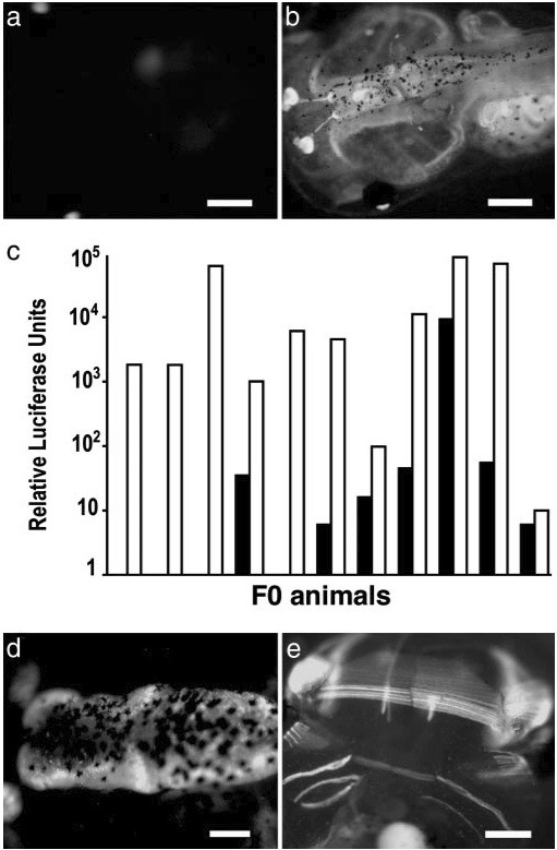 Fig 2. Inducibility and tissue-specific expression of the Tet system in trans- genic Xenopus F0 and F1 tadpoles. Expression of the GFP reporter gene in a 1-week-old F0 transgenic animal before (a) and after (b) 12 h of treatment with 5 ug/ml Dox. (c) Luciferase activity in the tail extracts of 11 different F0 transgenic animals before (solid bar) and after (open bar) induction with 5 ug/ml Dox for 48 h. Tissue-specific expression in 1-week-old tadpoles induced with 5 ug/ml Dox using the NBetaT (d) and cardiac actin (e) promoters driving inducible GFP. [Bars = 500 um (a, b, and e) and 200 um (d).]