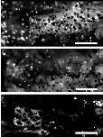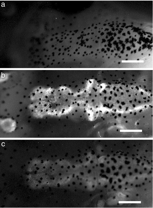 TH-induced proliferation of the cells that line the brain ventricle was monitored by anti-PH3 staining (bright spots) in 1-week-old transgenic tad- poles after 4 days of treatment with 10 nM 3,5,3'-triiodothyronine (a), 10 nM 3,5,3'-triiodothyronine plus 50 ug/ml Dox (b), or untreated tadpoles (c). (The left is anterior in all images.) (Bars = 500 um.)