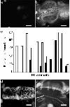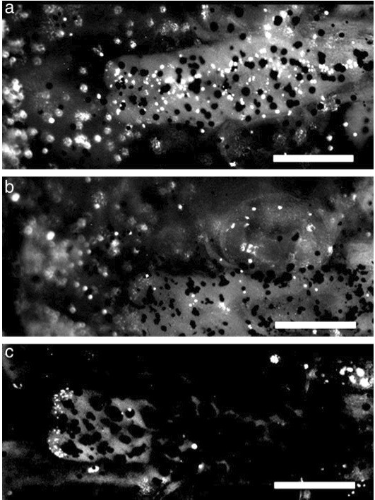 Fig 3. Kinetics of induction in the brain of the TRDN/GFP fusion protein transgene driven by the NBetaT promoter. Dox (50 ug/ml) was added to the rearing water. The same animal before induction (a), after 12 h of Dox induction (b), and 24 h after withdrawal of Dox (c). (The left is anterior in all images.) (Bars = 500 um.)