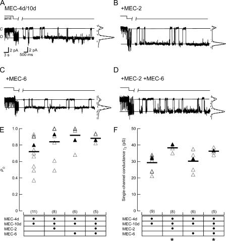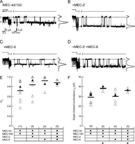 Figure 1. Single-channel recordings from outside-out patches. (A) MEC-4d/10d only. (B) MEC-4d/10d + MEC-2. (C) MEC-4d/10d + MEC-6. (D) MEC-4d/10d + MEC-2 + MEC-6. In A–D, two sections are shown: the left demonstrates the sensitivity of the channel to amiloride (50 μM), while the right shows the channel behavior in control saline. Vhold = −150 mV. Closed and open states are labeled C and O respectively and indicated by solid lines. To the right of each record is an all-points histogram of the same trace; dotted lines represent Gaussian fits to each peak. Open probability (E) and single-channel conductance (F) of patches containing a single channel. Data are summarized in Table I. Closed triangles represent the example patches shown in A–D. Bars indicate mean values for each isoform. Number of patches indicated in parentheses. *, significantly different from MEC-4d/10d (P < 0.01).