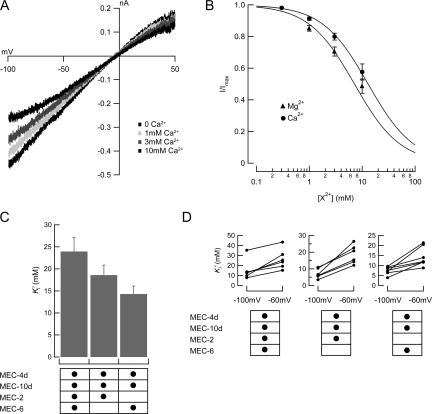 Figure 3. Block by divalent cations. (A) Macroscopic I-V curve of an outside-out patch coexpressing MEC-4d/10d, MEC-2, and MEC-6 exposed to varying Ca2+ concentrations. (B) Dose–response curves for blockade by Ca2+ and Mg2+ at −100 mV. The smooth curve is fit to the average values assuming a Hill coefficient of 1: . Measured Ki' was 12.9 mM for Ca2+, 7.0 mM for Mg2+. (C) Apparent Ca2+ inhibition constant, Ki' as a function of auxiliary subunits. Vhold = −60 mV. (D) Voltage dependence and variation of block affinity. Each line represents a single patch, with Ki' measured at −60 and −100 mV.