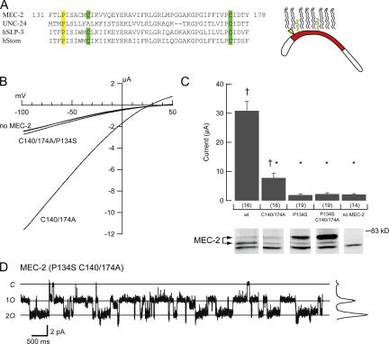 Figure 6. Characterization of cholesterol-binding mutants of MEC-2. (A) Alignment of selected PHB family members. MEC-2 and UNC-24 are coexpressed in vivo. MEC-2 is also represented schematically on the right. In yellow, P134, required for cholesterol binding. In green, C140 and C174 required for palmitoylation (Huber et al., 2006). (B) I-V relationship of channels lacking MEC-2, containing MEC-2 double mutant, and MEC-2 triple mutant. MEC-2(P134S) single mutant currents are essentially indistinguishable from the triple mutant and are omitted for clarity. (C) Average currents recorded from MEC-2 mutant-expressing cells (top). Bars are mean ± SEM. Sample size is indicated in parentheses below each bar. â , P < 0.005, compared with the absence of MEC-2; *, P < 10â6 compared with wild-type MEC-2. Western blot of MEC-2 isoforms (bottom). For clarity, lanes corresponding to each isoform are aligned with the data in A. All lanes were from the same blot (with identical contrast manipulation). Similar results were obtained in a total of three independent experiments. (D) Single-channel activity from an outside-out patch of a cell expressing triple mutant MEC-2. These data were used to measure single-channel conductance. Solid lines indicate zero, one or both channels open; all-points histogram is shown on the right.