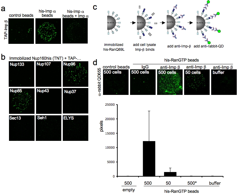 Figure 2. Using SINBAD as pull-down method with increased sensitivity.(A) Approx. 10 Ni-NTA beads were incubated with reticulocyte lysates containing his-Importin α or his- Importin α together with in vitro translated TAP-Importin β(wt) in the presence or absence of excess Importin α. QD655 were added, beads were isolated and imaged. (B) his-Nup160 was translated in reticulocyte lysates and incubated with equal volume (2 ul) of in vitro translated Nup133-TAP, Nup107-TAP, Nup96-TAP, Nup85-TAP, Nup43-TAP, Nup37-TAP, Seh1-TAP, Sec13-TAP and ELYS-TAP for 30 min. Approx. 5 Ni-NTA beads were added together with streptavidin-coated QDs655 and imaged by confocal microscopy on the bead surface. (C) Schematic illustration of SINBAD for the pull-down of endogenous proteins. (D) Hypotonic cell lysates corresponding to 500 or 50 cells were incubated with Ni-NTA beads coated with his-RanQ69L. Bound endogenous Importin β was visualized as described in (C). (E) Random 10 µm2 areas were imaged and fluorescence intensity at 655 nm was plotted. n = 20.