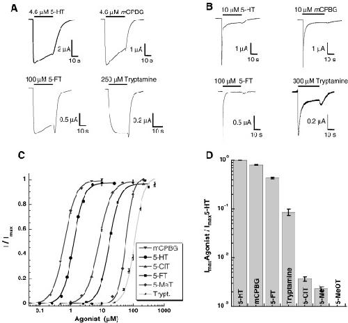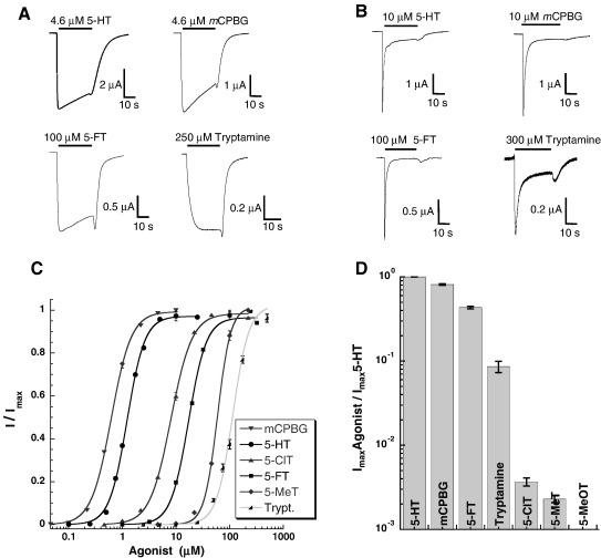 Fig. 2. Properties of 5-HT3A and 5-HT3AB receptors expressed in Xenopus oocytes. Typical responses to maximal concentrations of 5-HT, mCPBG, 5-FT and tryptamine in (A) 5-HT3A and (B) 5-HT3AB receptors; (C) Concentration–response curves in 5-HT3A receptors; (D) Relative efficacies (Rmax) of agonists compared to 5-HT.
