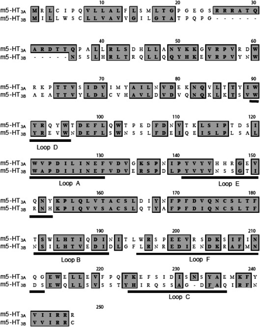 Fig. 3. Alignment of 5-HT3A and 5-HT3B subunit sequences. Residues that have similar chemical properties are shown in grey. The binding loops that constitute the binding site are underlined.