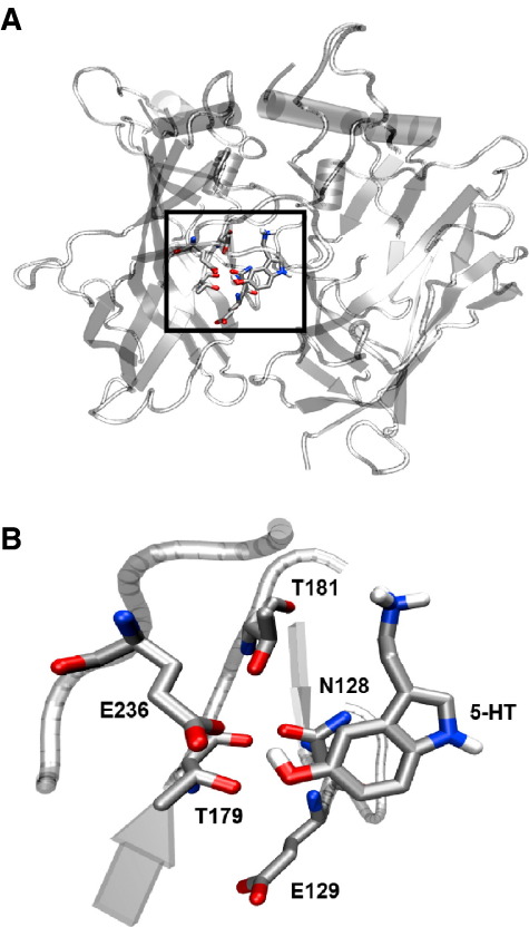 Fig. 4. 5-HT docked into a homology of the 5-HT3 receptor (Reeves et al., 2003). A. The extracellular domains of two subunits of the 5-HT3 receptor showing the location of the binding pocket (boxed) at their interface. B. Enlarged image of the binding site showing the proximity of the hydroxyl group of 5-HT to the hydrophilic residues Asn128, Glu129 Thr179, Thr181 and Glu236.