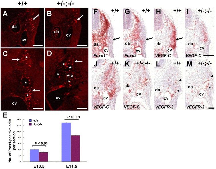 Accumulating evidence suggests that in the vertebrate embryo, acquisition of arterial and venous identity is established early by genetic mechanisms, including those regulated by vascular endothelial growth factor (VEGF) and Notch signaling. However, although the COUP-TFII nuclear receptor has recently been shown to regulate vein identity, very little is known about the molecular mechanisms of transcriptional regulation in arterial specification. Here, we show that mouse embryos compound mutant for Foxc1 and Foxc2, two closely related Fox transcription factors, exhibit arteriovenous malformations and lack of induction of arterial markers whereas venous markers such as COUP-TFII are normally expressed, suggesting that mutant endothelial cells fail to acquire an arterial fate. Notably, consistent with this observation, overexpression of Foxc genes in vitro induces expression of arterial markers such as Notch1 and its ligand Delta-like 4 (Dll4), and Foxc1 and Foxc2 directly activate the Dll4 promoter via a Foxc-binding site. Moreover, compound Foxc mutants show a defect in sprouting of lymphatic endothelial cells from veins in early lymphatic development, due to reduced expression of VEGF-C. Taken together, our results demonstrate that Foxc transcription factors are novel regulators of arterial cell specification upstream of Notch signaling and lymphatic sprouting during embryonic development.