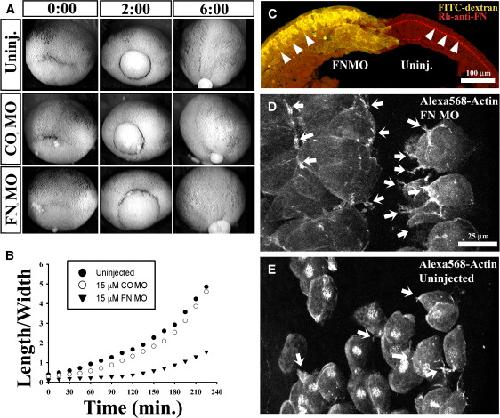 (B) Individual explants showing convergence of the mesoderm with respect to the ectoderm (arrowheads versus arrows) were stained for fibronectin fibrils.