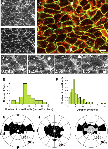 (I) Long-lived lamellipodia (black) are found at the mediolateral ends of cells whereas short-lived lamellipodia (gray) are more randomly oriented. Scale bar in (C) is 25 μm and in (D) is 10 μm (a, anterior; p, posterior; ml, mediolateral). This time-lapse sequence can be viewed in Movie S2. |